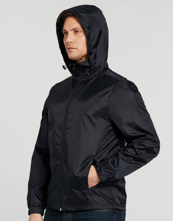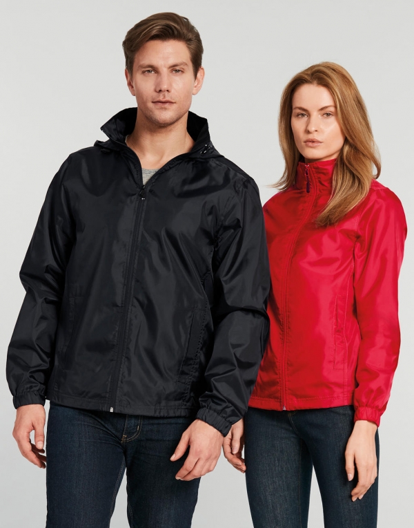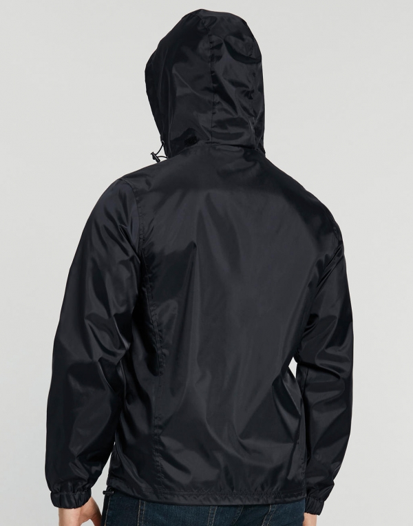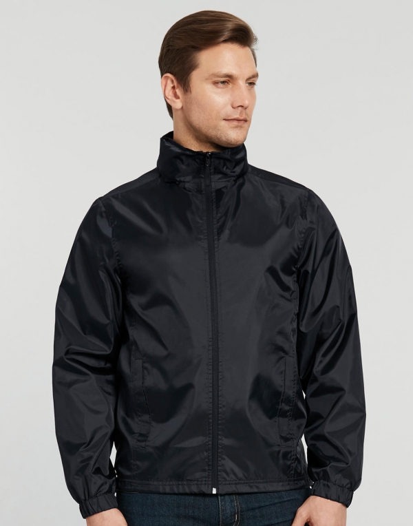 Unisex vetrovka, 100% polyester, elastika na rokavih, odporna na vodo in veter, zadrga, 70 g/m2, kapuca skrita v ovratniku, podložena
